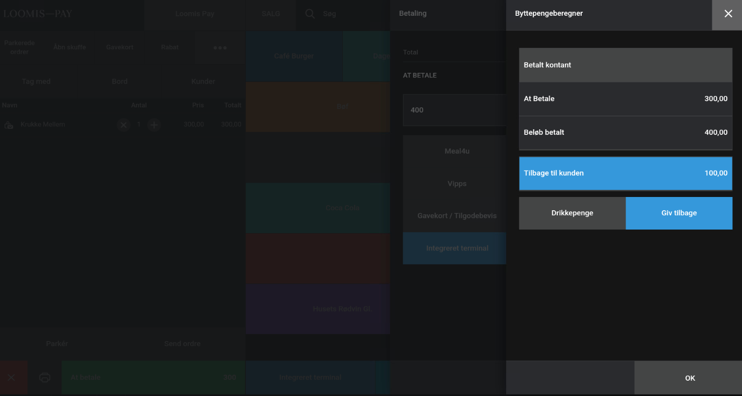 Når kunden betaler mere end det samlede beløb i kontanter, får du valget mellem at returnere det ekstra beløb på regningen eller registrere det som drikkepenge.