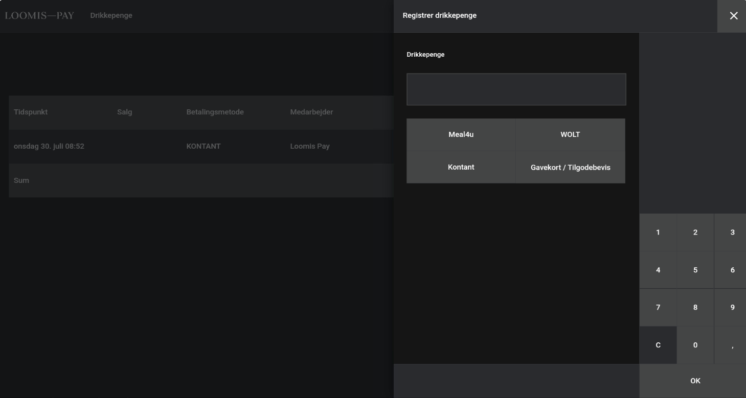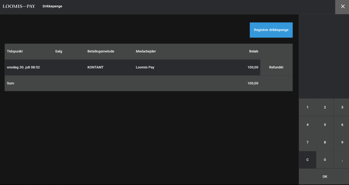 Når du trykker på denne knap, kommer du til drikkepengeoversigten, hvor du kan se tidligere registrerede drikkepenge.