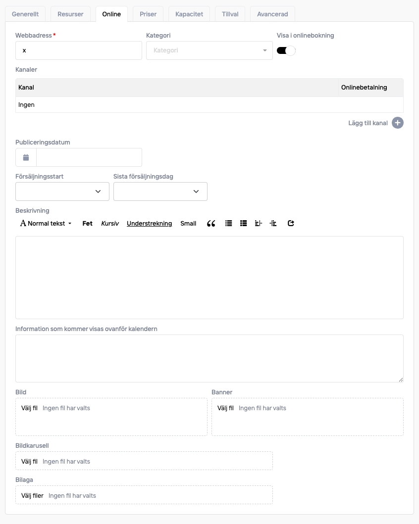 • Attachments: If you want, you can upload up to 20 attachments that will be displayed in a list at the bottom of the event in the online booking. The attachments can be images, documents, presentations. Most known file types are supported, but not videos.