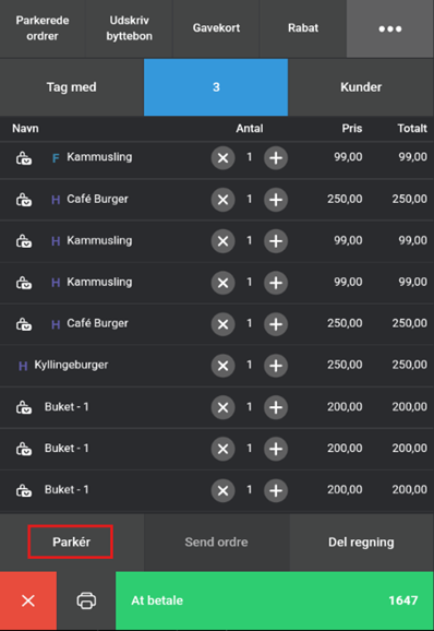 You can also to add more or edit the order on a table by pressing the Send to POS button. To save the changes in the cart, press the grey Park button.