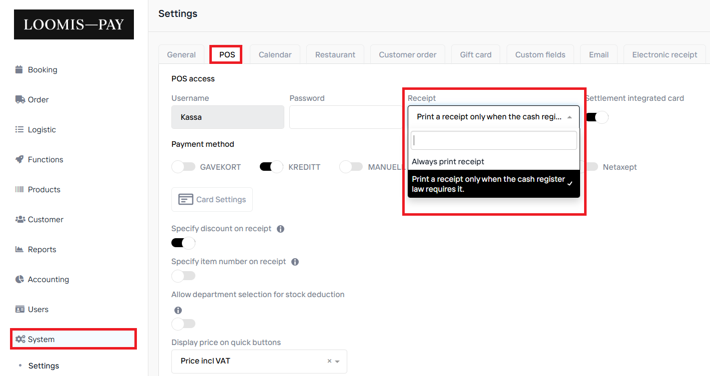 In the drop down menu under Receipts, choose if you would like the receipts to:
