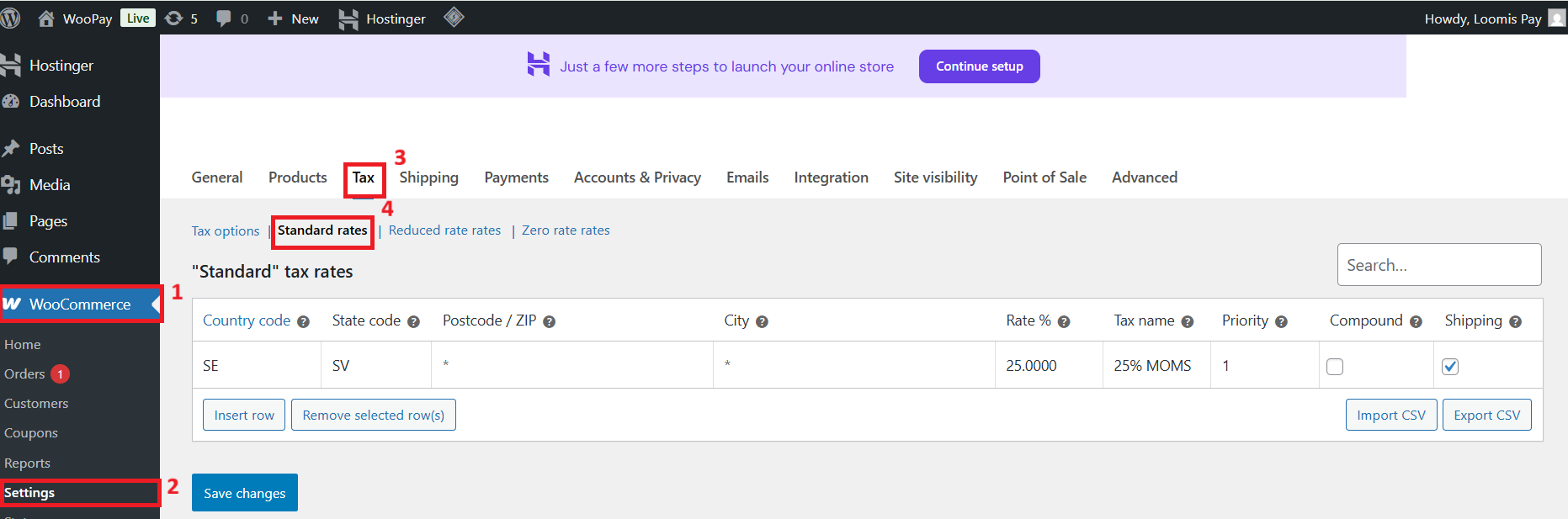 Log in to Wordpress and go to WooCommerce -> Settings -> Tax