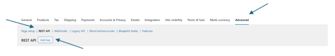 Go to WooCommerce -> Settings -> Advanced -> Rest API -> ‘’Add Key’’ or ‘’Create an API key’’.