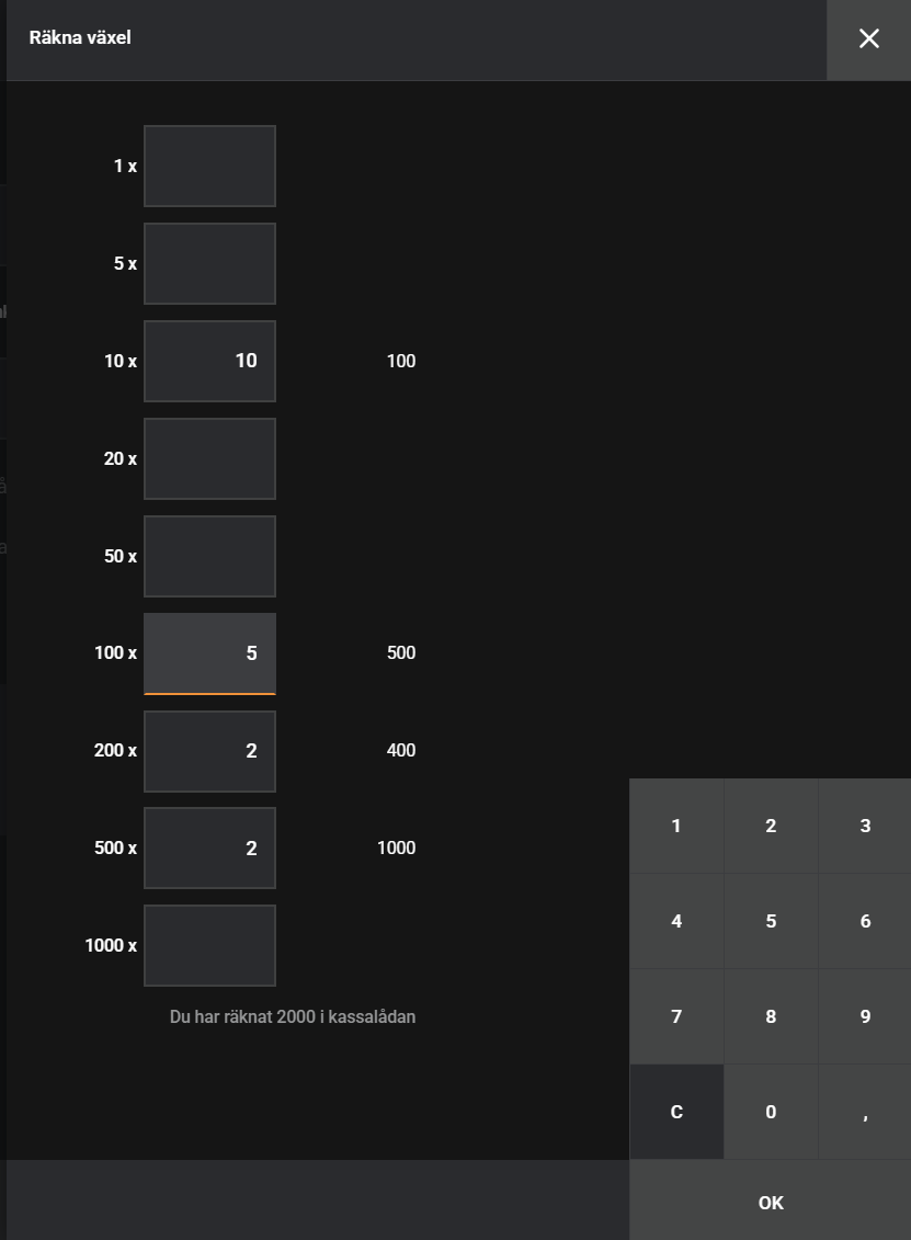 You must first review the cash balance in the coloumn. You can either enter this completely manually or use our change counter to count cash faster. You open the exchange counter by pressing Exchange counter at the bottom of the window, next to Open drawer.