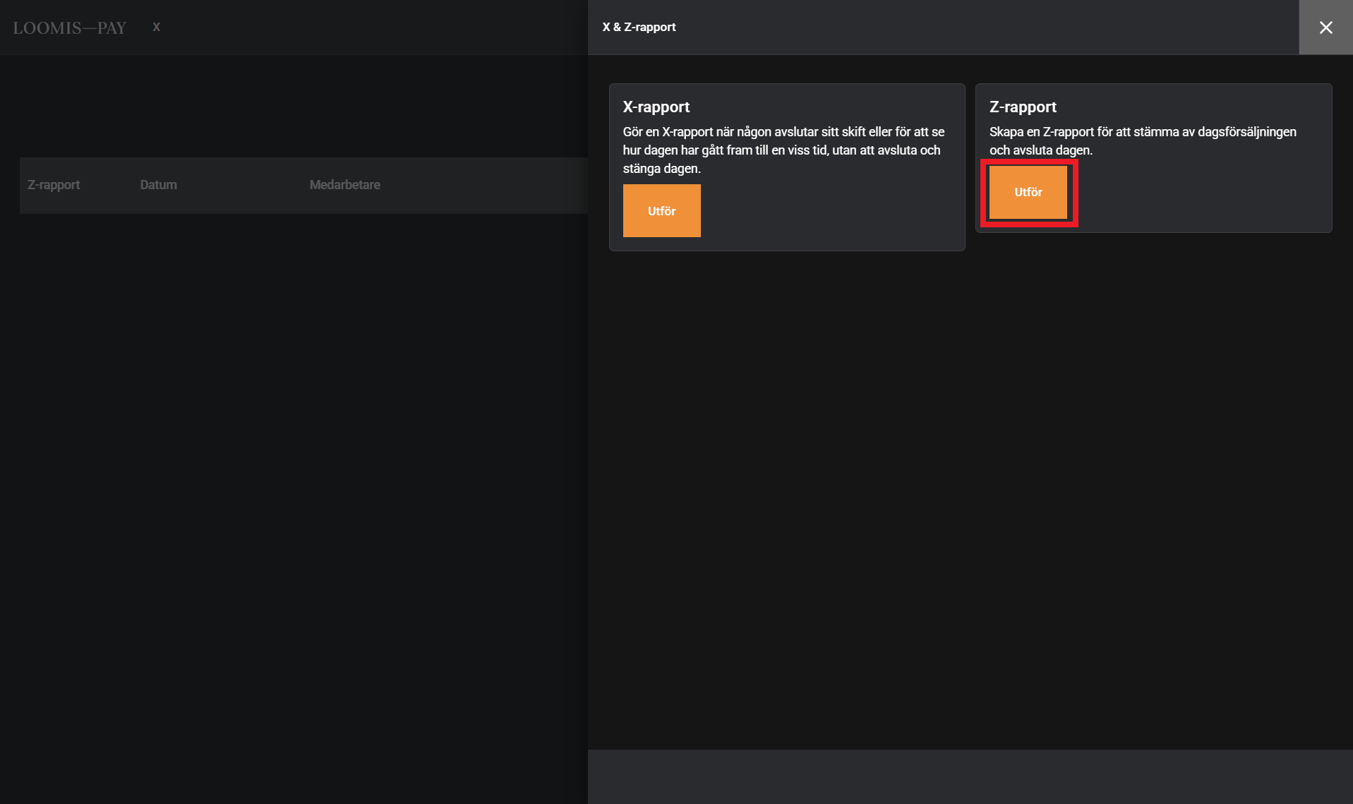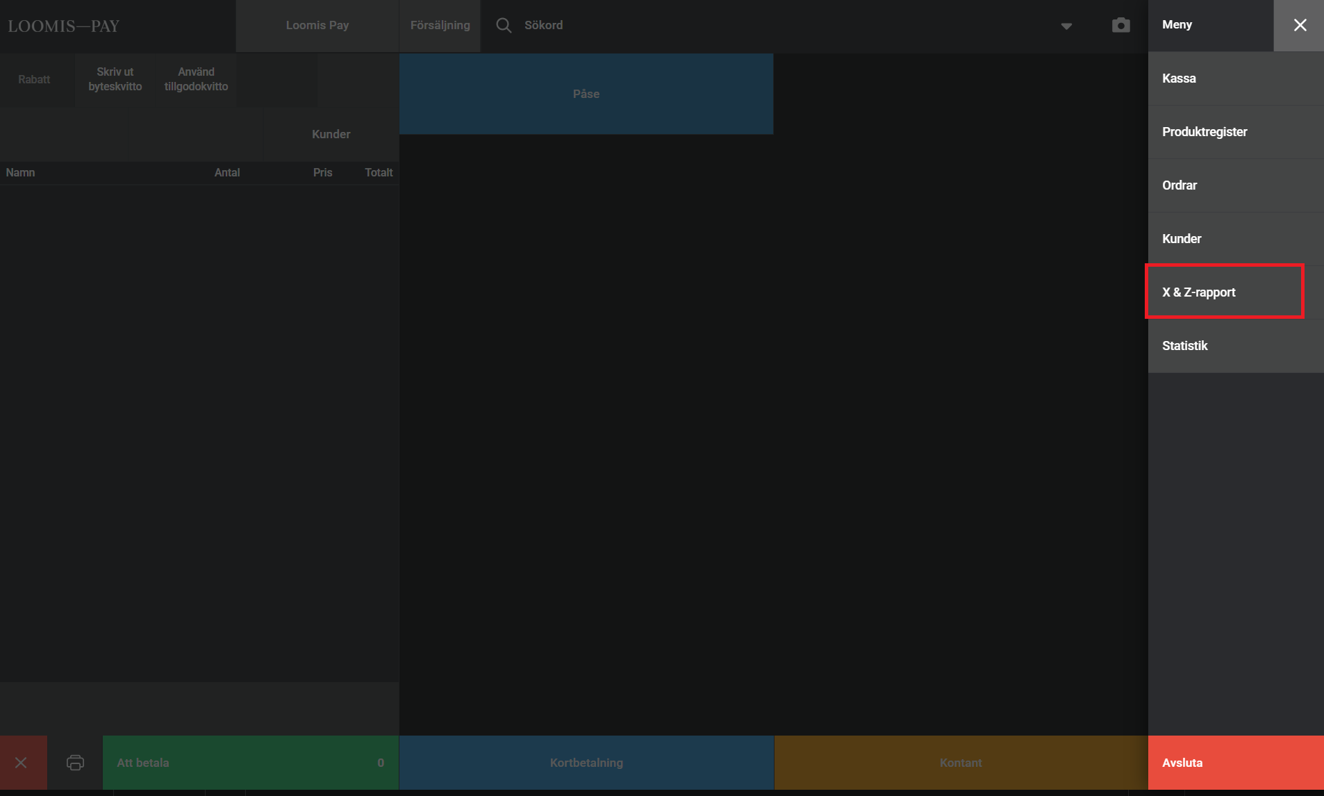 Open the main menu in the right corner of the checkout screen and select X & Z- reports