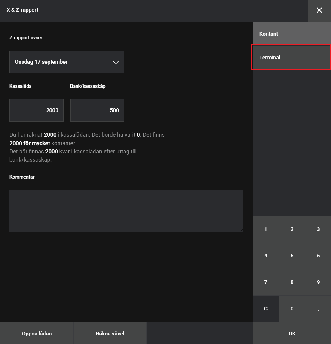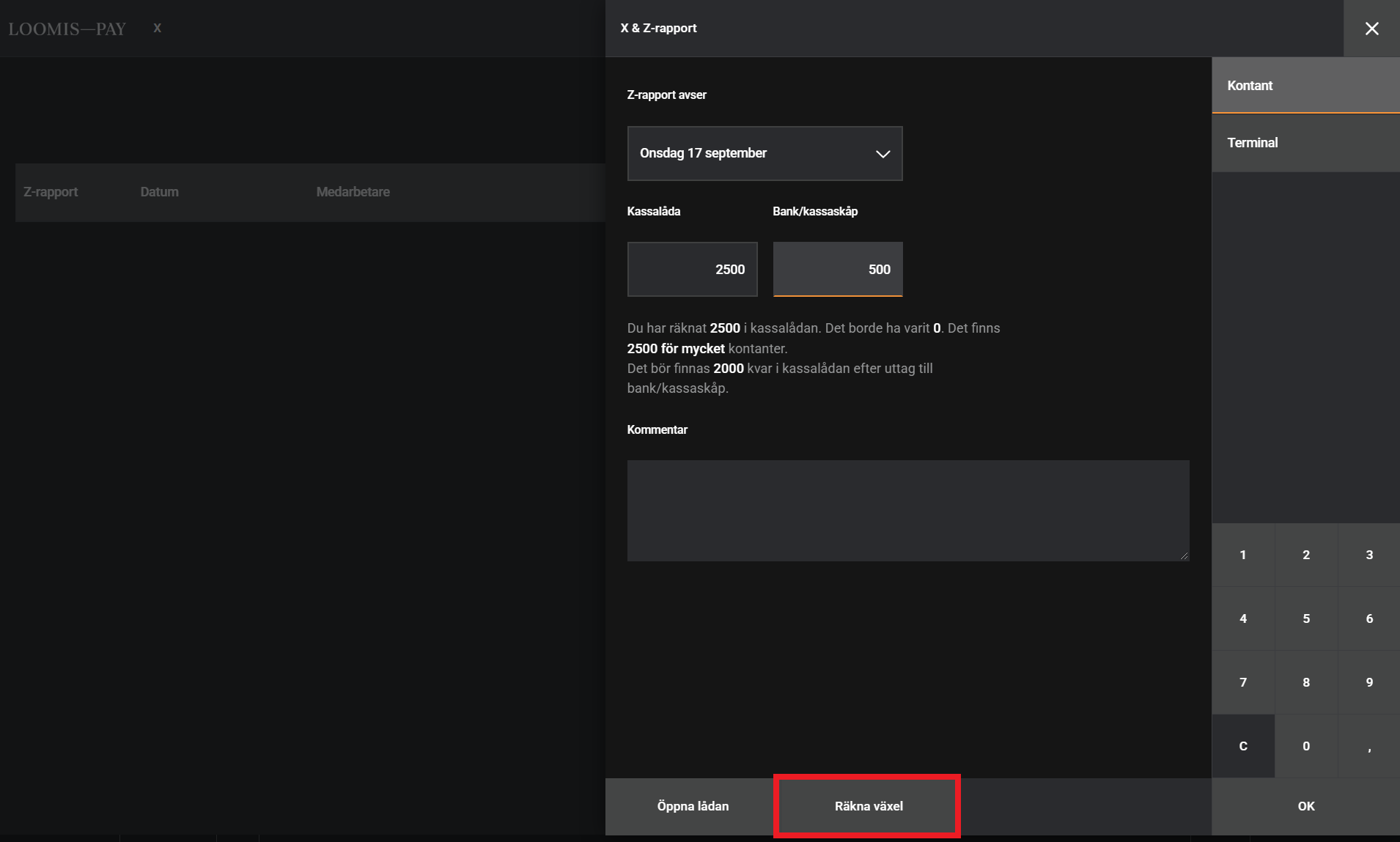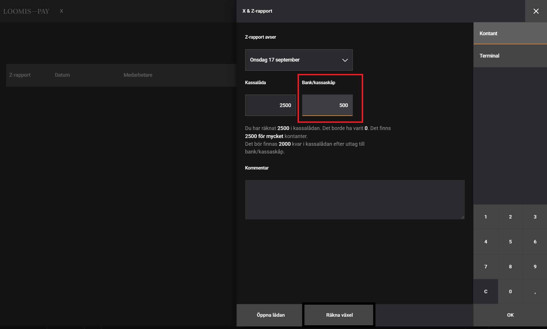 NOTE: you must enter 0 in the BankAxept, Visa and Mastercard fields in daily settlement, then the Loomis field will fill in automatically. This is a must to reconciling the terminal at the moment.