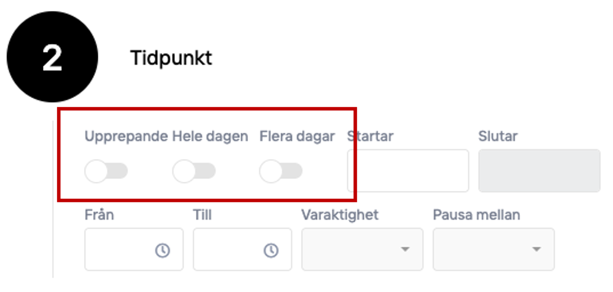 Here you set if it is a one time or recurring event, if it runs for one or multiple days and specify the time.