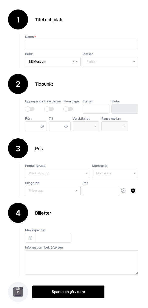 Choose what department/store it belongs to: If the ticket is sold in-store, the revenue will be booked to the department where that POS is located. If the ticket instead is sold online, the revenue will be booked to the department that you select here.
